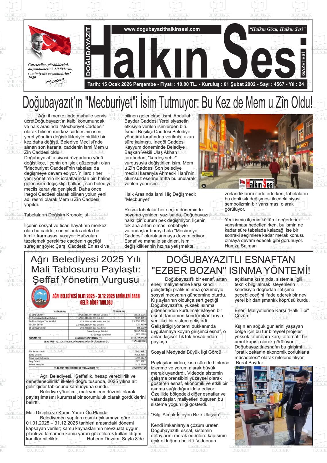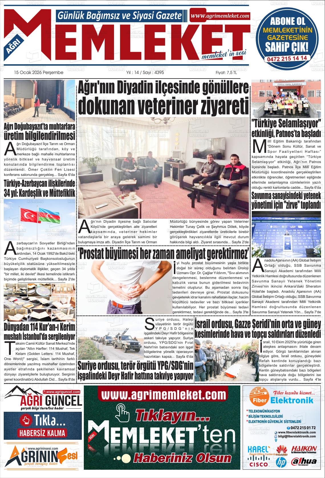 Ağrı Yerel Gazeteleri 15 Ocak 2026, Perşembe Günü Manşeti