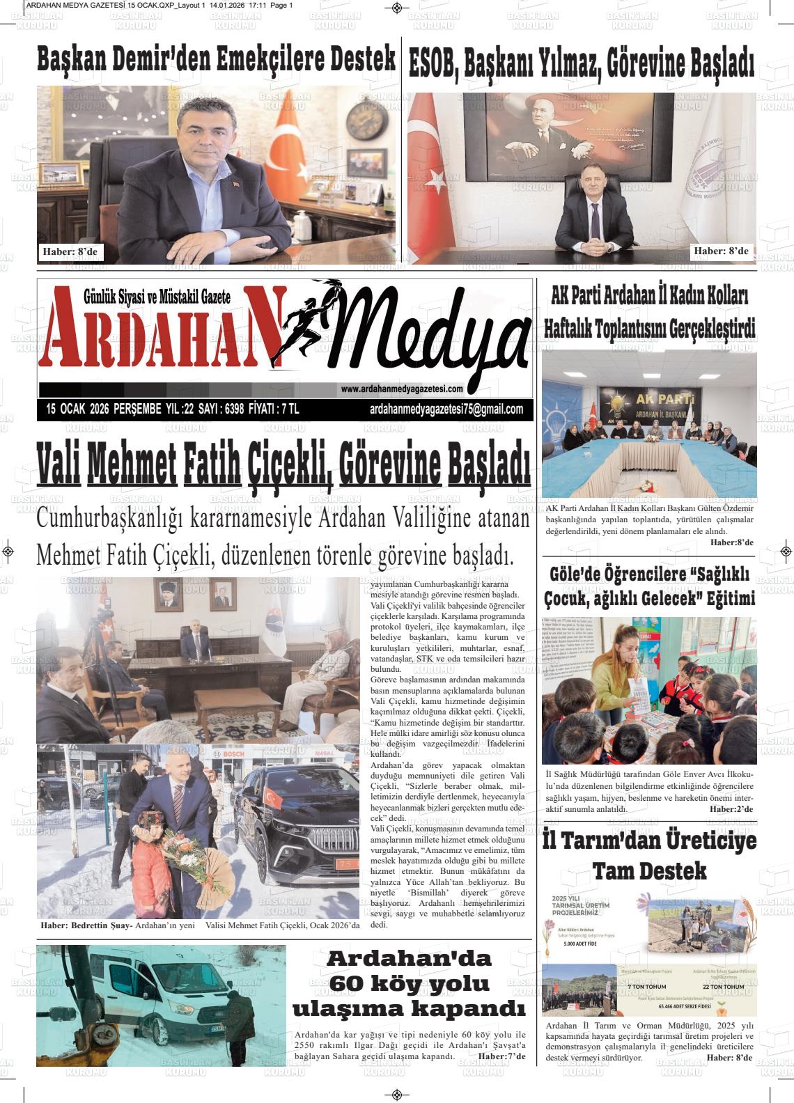 Ardahan Yerel Gazeteleri 15 Ocak 2026, Perşembe Günü Manşeti