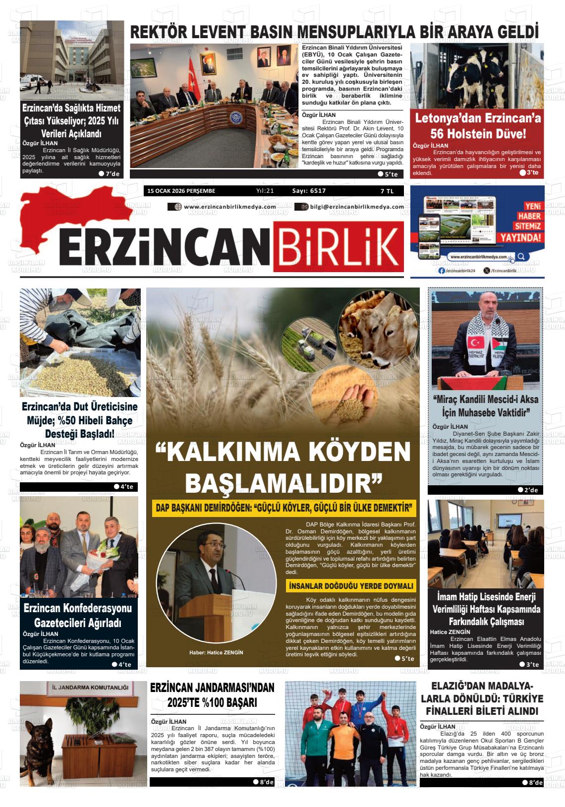 Erzİncan Yerel Gazeteleri 15 Ocak 2026, Perşembe Günü Manşeti